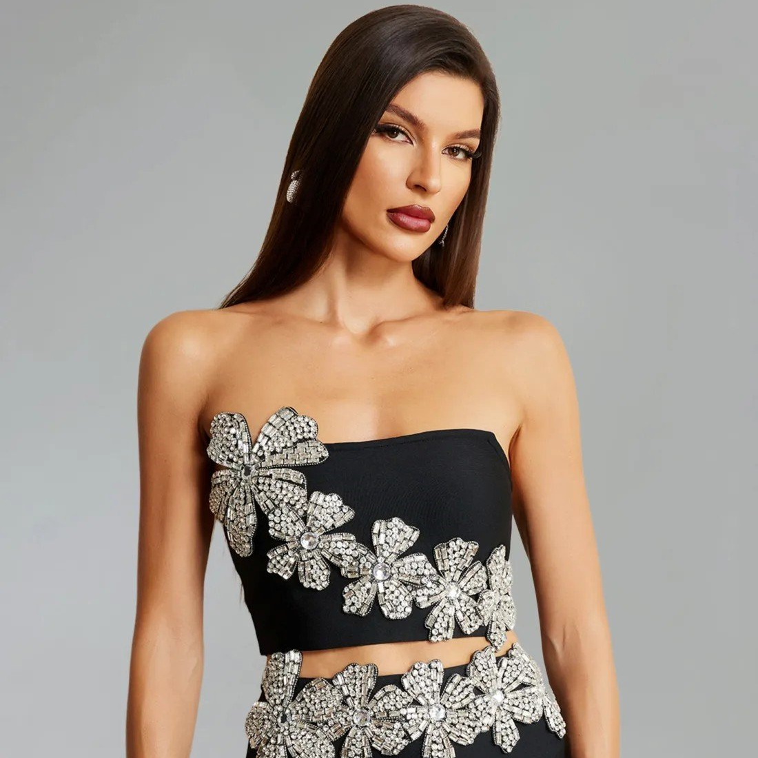Beaded Diamond Yellow Cropped Top and Skirt Suit